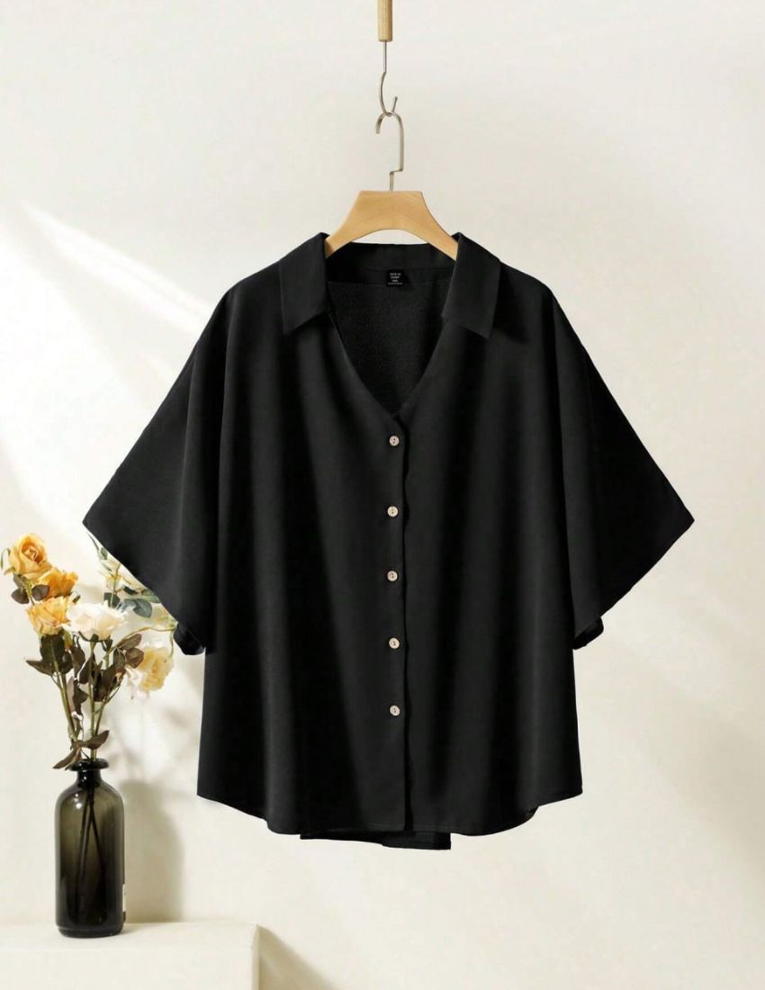 The design features a wide V-neck collar and short sleeves, giving it an airy and relaxed look. flowy sleeves and relaxed fit. The overall aesthetic is minimal and casual, suitable for everyday wear or a comfortable, laid-back outing.