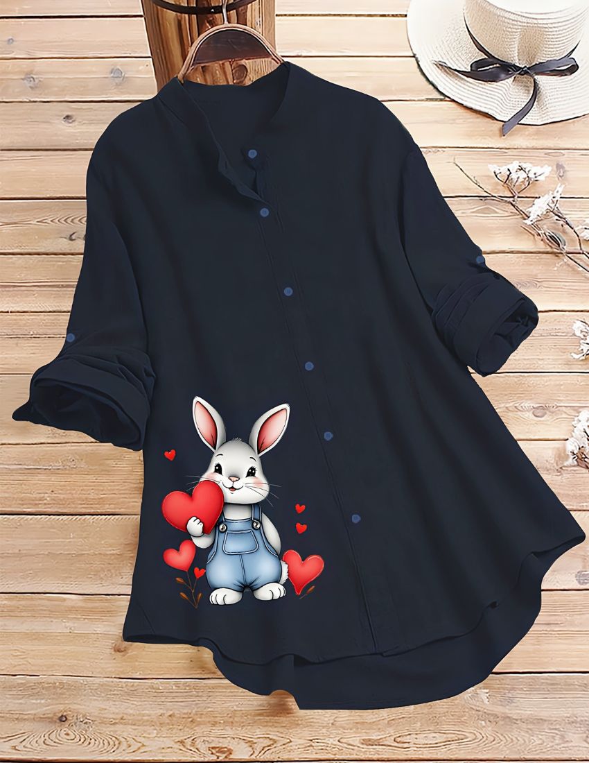 This stylish and comfortable button-up shirt. adding a playful and charming touch. With a relaxed fit, rolled-up sleeves, and a mandarin collar, this shirt is perfect for casual outings or lounging in style. making it a great choice for any season. Pair it with jeans or leggings for a cute and cozy look!