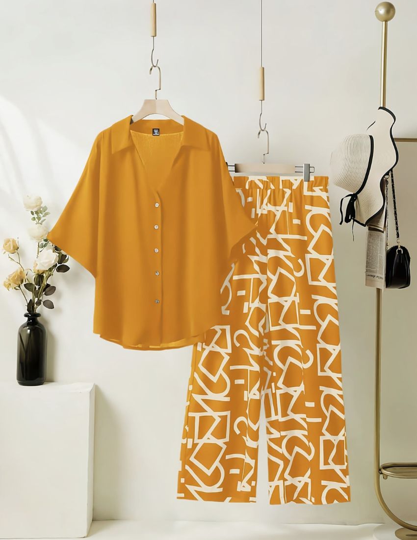 This stylish outfit features a flowing Mustard Yellow-colored button-down top with a relaxed fit and wide sleeves paired with matching palazzo pants adorned with an abstract geometric pattern. Perfect for casual outings or a chic relaxed look. Made in a beautiful color our signature smock-inspired top always stands out.