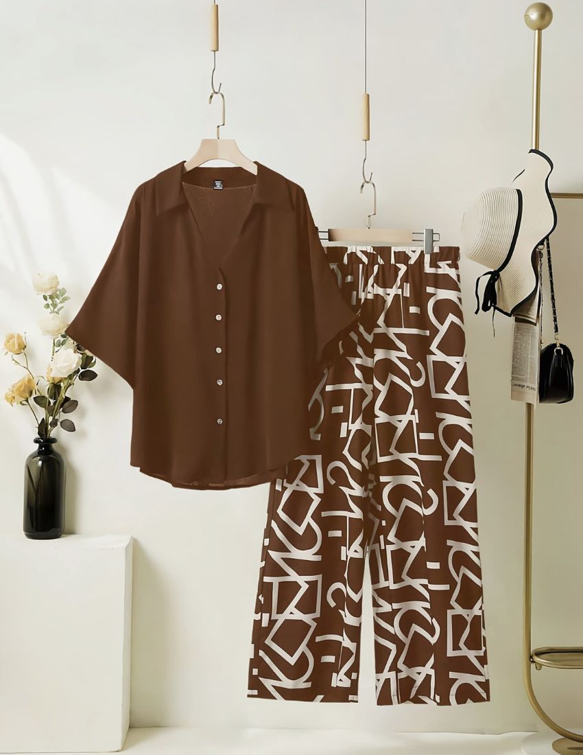 This stylish outfit features a flowing Penny brown-colored button-down top with a relaxed fit and wide sleeves paired with matching palazzo pants adorned with an abstract geometric pattern. Perfect for casual outings or a chic relaxed look. Made in a beautiful color our signature smock-inspired top always stands out.
