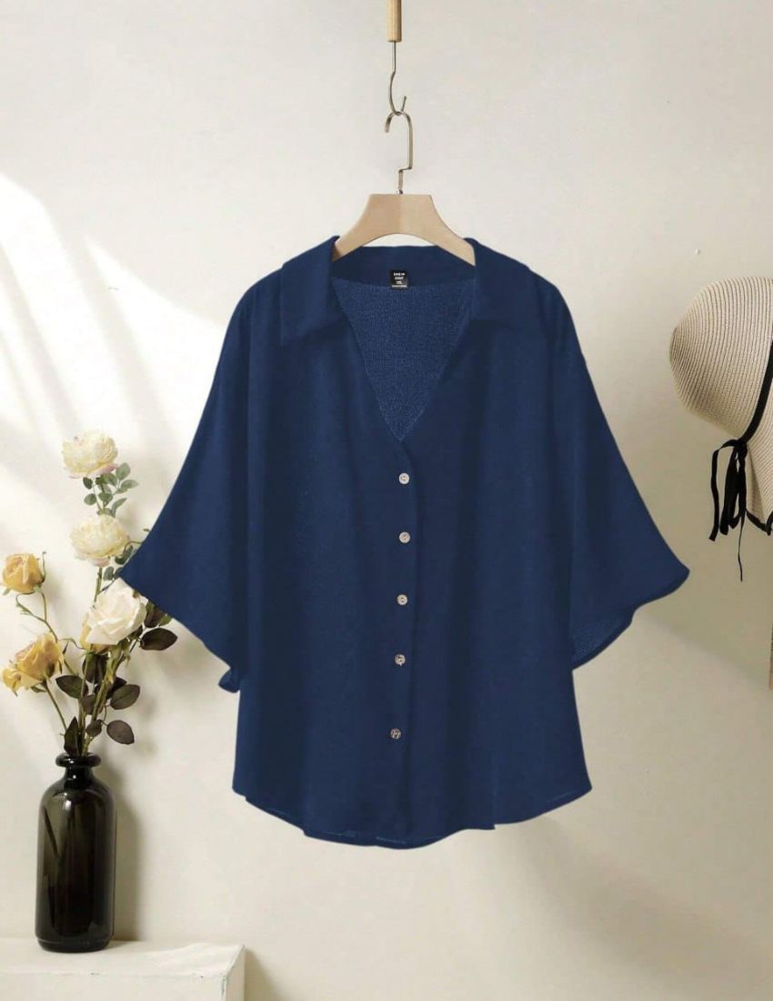 The design features a wide V-neck collar and short sleeves, giving it an airy and relaxed look. flowy sleeves and relaxed fit. The overall aesthetic is minimal and casual, suitable for everyday wear or a comfortable, laid-back outing.
